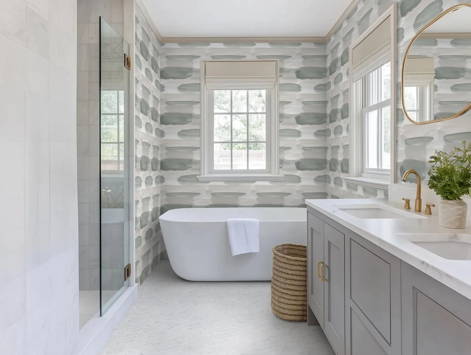 Soft watercolor wallpaper complements gray cabinetry, marble countertops, and brass fixtures in this serene bathroom oasis. Explore this calming design for your next renovation.