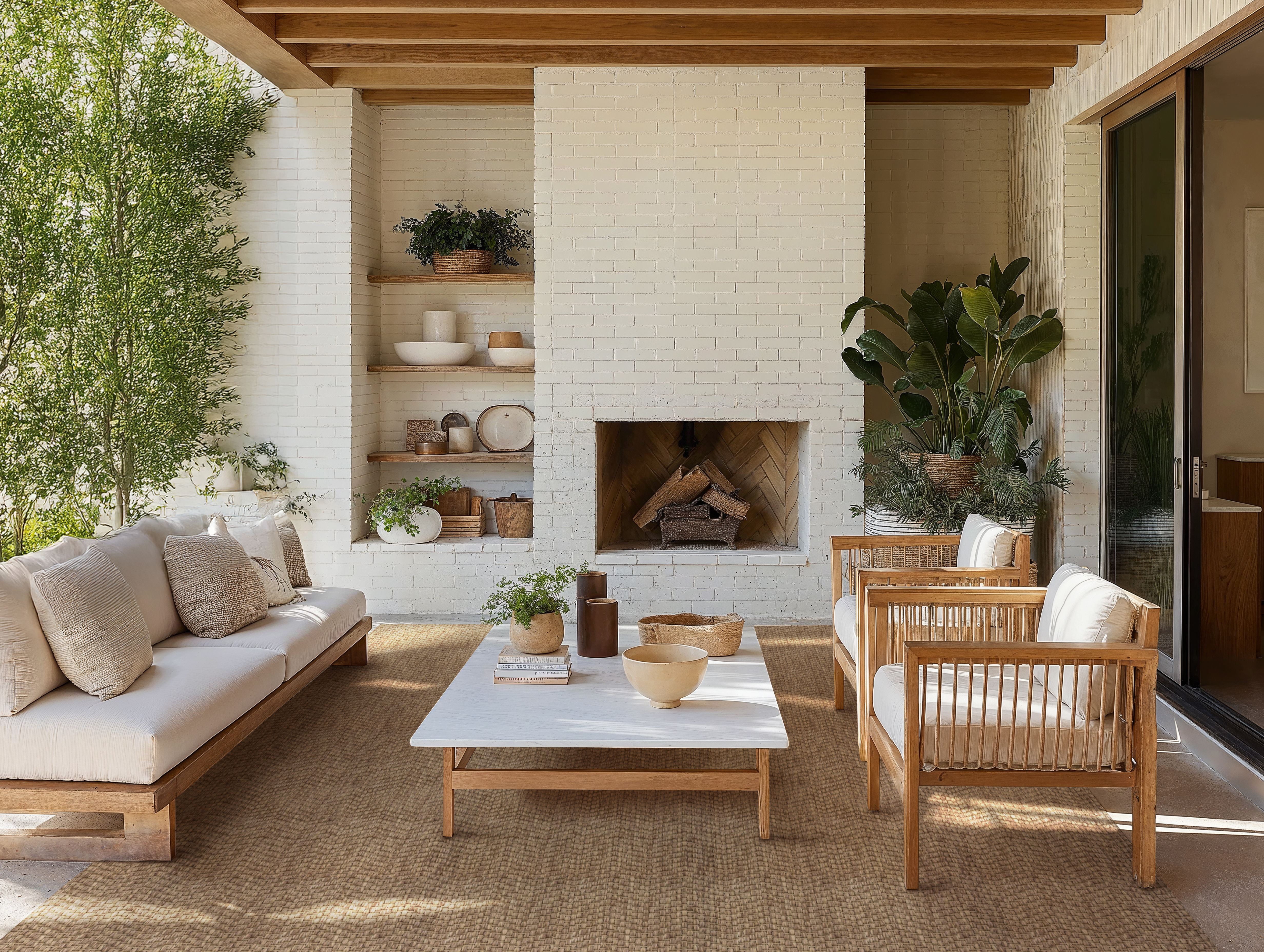 Textured white brick meets a sisal patterned rug and exposed wood beams. Neutral upholstered seating surrounds a low marble-top table in this enclosed lounge.