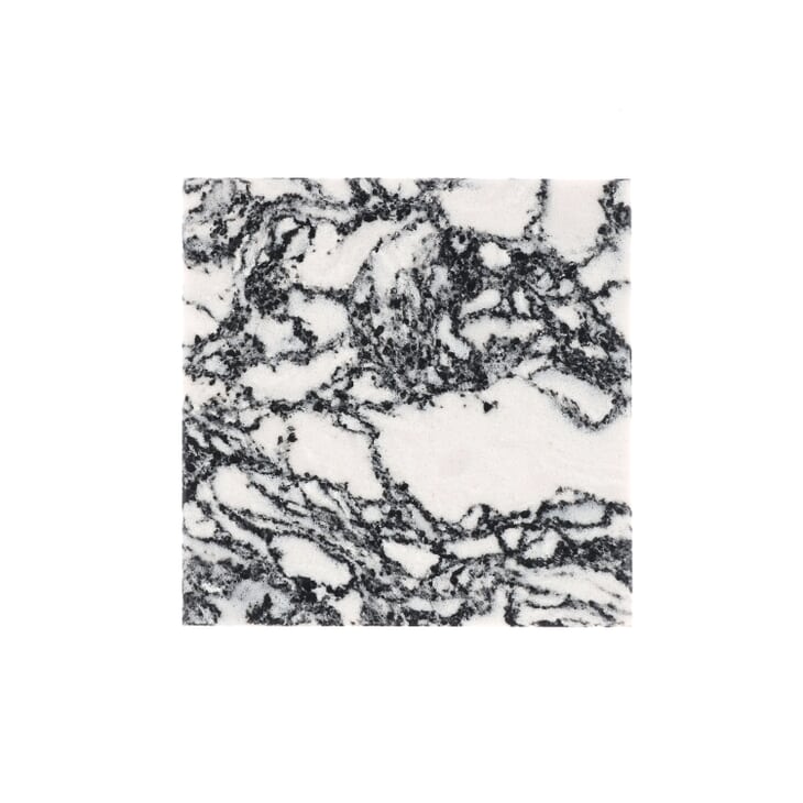 A white foundation is infused with robust black marble veining, creating a striking abstract effect where opposites definitely attract.