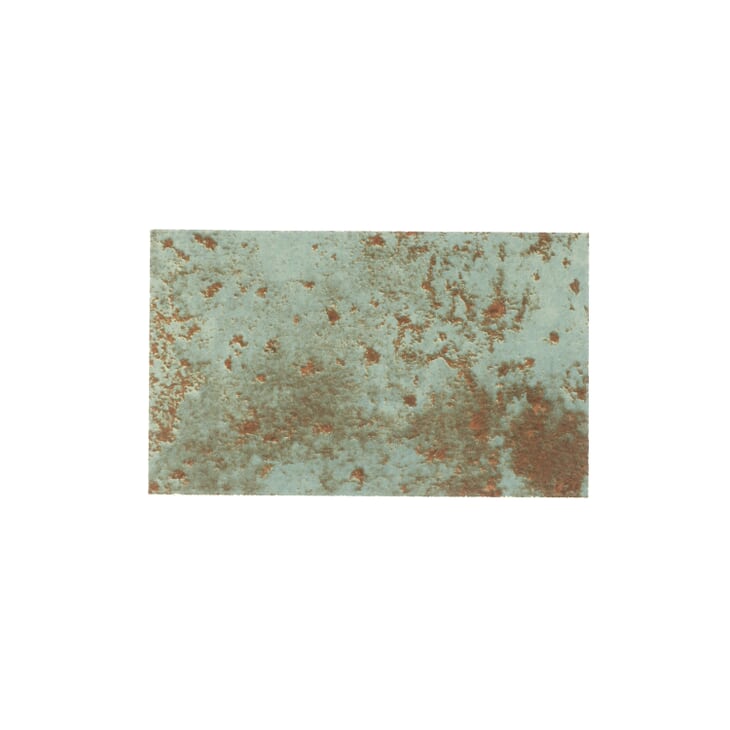 Oxo Verdigris is a stunning recreation of atmospheric copper oxidation in a timeless green patina color with a matte finish. It is stocked in 24-by-24-inch porcelain field tile.
