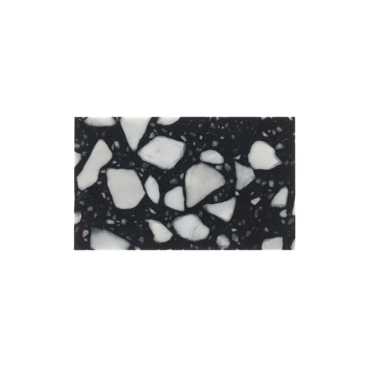 A favored material of ancient artisans, terrazzo is given sublime and modern allure with Veronese. Custom-crafted in Italy in 24-by-24-inch tile and 2-centimeter slabs, Veronese is composed of 95% marble and strengthened with 5% resin. It is offered in 3 colors: Multi-Colore, with chips of Arabescato Bianco marble and jewellike green and violet lepidolite mica; Crema, featuring Arabescato Bianco marble's softly neutral range; and Nero, with classic Bianco Carrara dramatically set into ink-black resin. All colorways are stocked in a honed finish, and slabs measure approximately 48-by-120 inches.