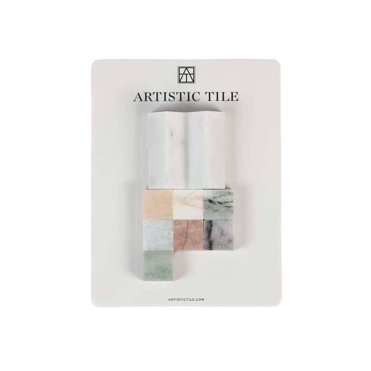 Pinnacle Fete adds variety to the modern classic Pinnacle design by inserting colorful, sculpted marbles and quartzites in a rhythmic patchwork within the carved, triangular flutes of the background stone. Pinnacle Fete is offered in 2 colorways: Nero, with rich blues, greens, pinks and gold against a ground of white-veined Nero marble; and Pastel, with multicolor marble inlays in a range of soft, pale shades, on a ground of crystalline Igloo marble. The full repeat is 24-by-24 inches, created by four distinct. 12-by-12-inch parts. The scintillating visual rhythm of the repeat will create walls of true sophistication.