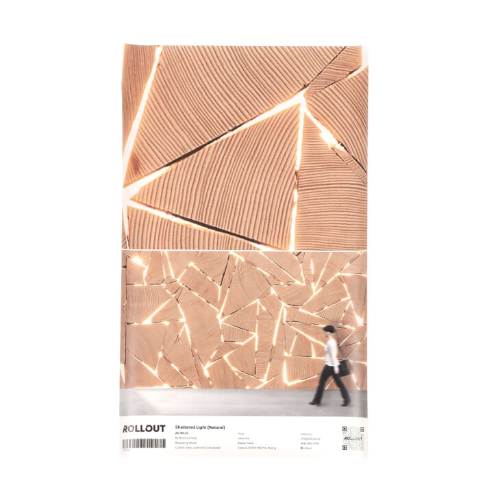 The imagery in the pattern Shattered Light is derived from artist and furniture designer Brent Comber's light and wood installations of the same name. The reimagining of salvaged wood pieces sourced from west coast forests, reconstructed and back-lit with embedded LED lighting adds a unique depth to a designed interior.