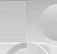 FormNation presents a family of soothing geometrics that combines diced-up circles and squares into woven meshes and undulating gradients. C-Squared combines horizontal, vertical and diagonal lines into a series of stripes, grids and fences that provide the background on which playful, counter-faded circles can appear. Although some of the disks appear centered and orderly, they’re not entirely aligned. Curved edges will occasionally overstep their bounds into neighboring areas. The slightly shifted pattern creates visual interest while maintaining a formal, repetitive rigor.