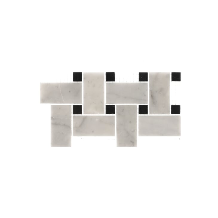 Add fresh and modern style to any room within your home with these interlaced, basket weave-designed beauties from our Trenza Collection. Composed of white Carrara marble and accented with black dots, this classic basket weave design will bring warmth and a natural ambience to your home for many years to come. The mesh backing not only simplifies installation, but also allows the tiles to be easily separated, adding to design flexibility.