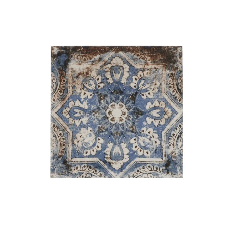 With a Mediterranean-inspired feel, the Lenox Flora is sure to captivate. This 8x8 Porcelain Tile with its antiqued blue patterning will bring a beautiful sense of artistry your design. Use on walls or floors.