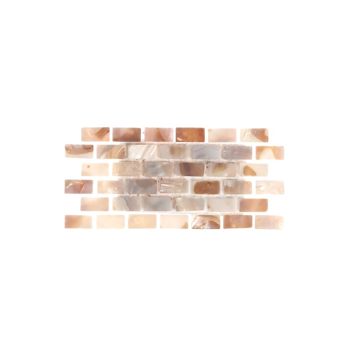 This captivating South Seas pearl tile in shades of brown is artfully arranged in a classic brick pattern. The pearl shell glass will add a durability and lasting exquisiteness to your kitchen or fireplace installation. These tiles are mesh- mounted and bring a sleek and contemporary clean design to any room. Pearl tile is not recommended for installation where it will be submerged in water, such as a shower floor or pool, as submersion will cause the tile to darken over time.