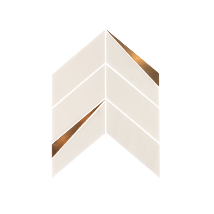 Vara Thassos Polished Marble and Brass Mosaic tiles feature clean, white Thassos marble in a classic chevron pattern, with porcelain-backed brass inlays that add a contemporary appeal to the glamorous design. A polished finish on the marble enhances the reflective shine, creating an eye-catching and bold visual.