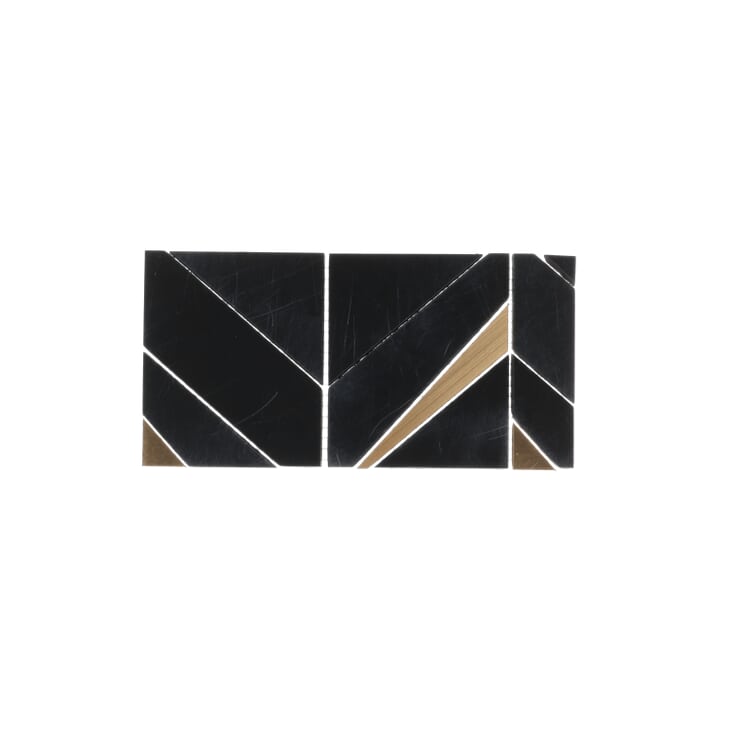 Vara Nero Polished Marble and Brass Mosaic tiles feature elegant black Nero Marquina marble in a classic chevron pattern, with porcelain-backed brass inlays that add a contemporary appeal to the glamorous design. A polished finish on the marble enhances the reflective shine, creating an eye-catching and bold visual.