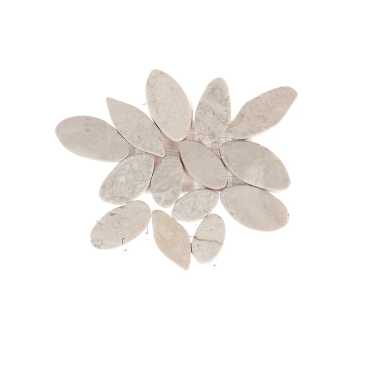 Nature Flower Lovina White Pebble Mosaic Tile is made up of petal-shaped slices of white marble that create a dynamic floral pattern mosaic. The subtle color variations of the stone provide a soft organic quality, reinforced by a natural honed finish. This botanical pattern, combined with the beauty of natural stone, creates a nature-inspired calm and spalike environment.
