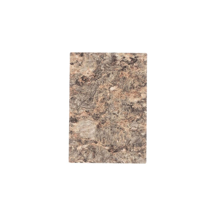 Varied sizes of a light and dark gray quartz laminate design intermix with black particulates and off-white mica. These features are highlighted by a light-tan-and-clay color throughout this medium-scale granite. The approximate design repeat length is 37 inches; the approximate design repeat width is 36.5 inches.