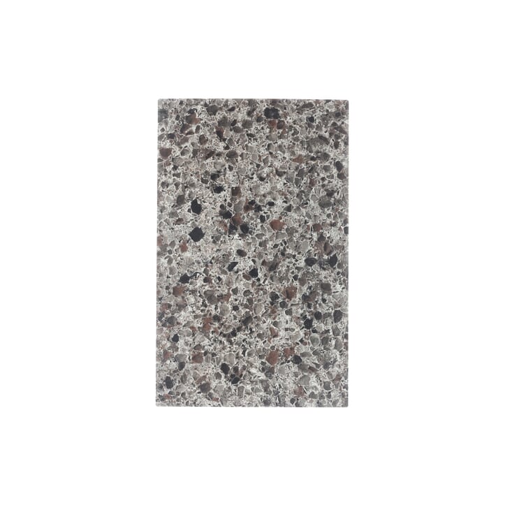 Ink Vesta is a medium-scale terrazzo look that has a light background|with gray|black and brown highlights. The approximate design repeat width is 60 inches; the approximate design repeat length is 49 inches.