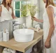 The Leela design is a modern and sleek vessel sink made of sturdy white high-quality ceramic that is perfect for any bathroom. It is a playful design that is made to perform. With a practical sturdy base and round design, it is a gorgeous and clean-looking small sink that will fit into any layout. A round sink is a modern sink design that fits well into any space.