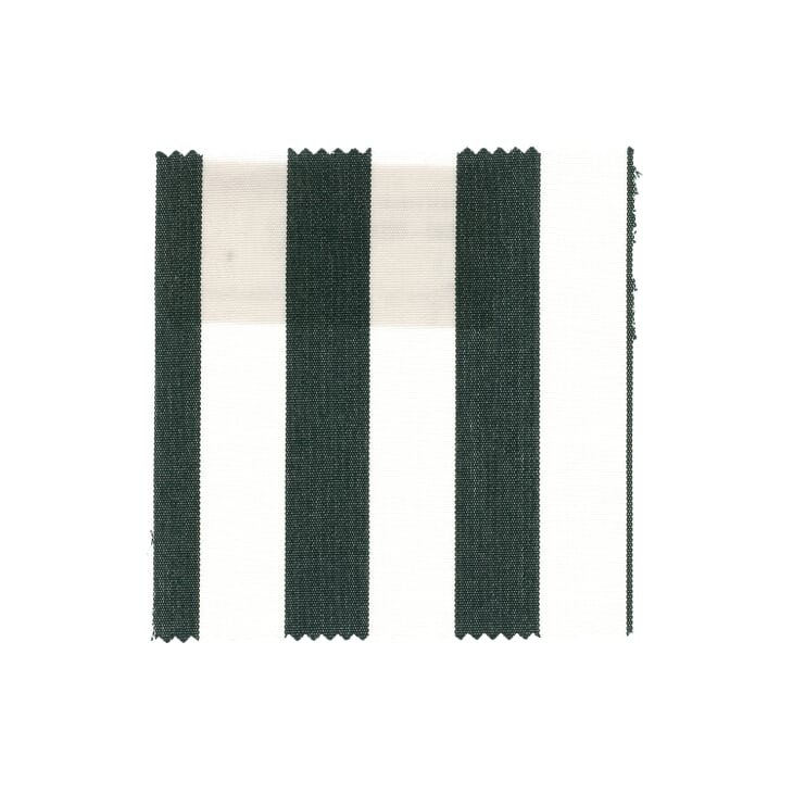 A classic forest green and white bar stripe with a plain weave construction. This long-lasting Sunbrella fabric is resistant to stains, pilling, and abrasion. It is an excellent choice for any application, including indoor and outdoor upholstery, curtains, pillows, boat upholstery, and everything in between.