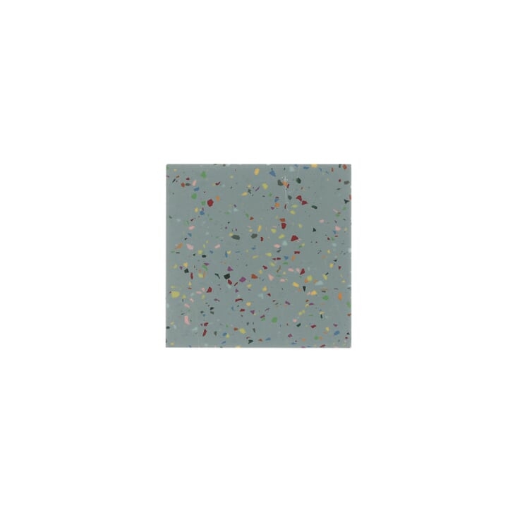 Blue gray solid surface with rainbow aggregate recycled from other Durat materials for countertop application.