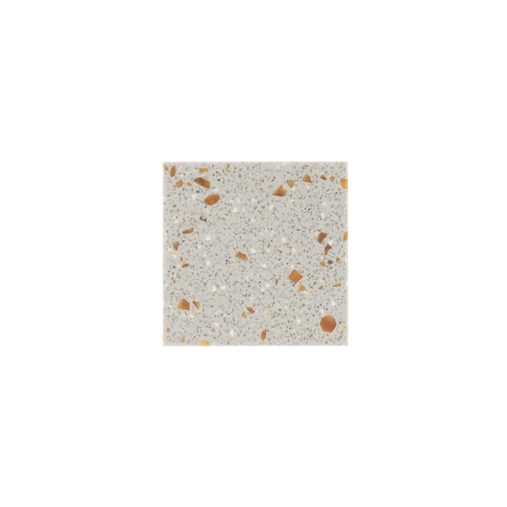 Light gray solid surface with clear, white, and gold recycled hard plastic aggregate for countertop application. Durat's Palace Collection features larger aggregate and more unique color combinations than the standard collection.