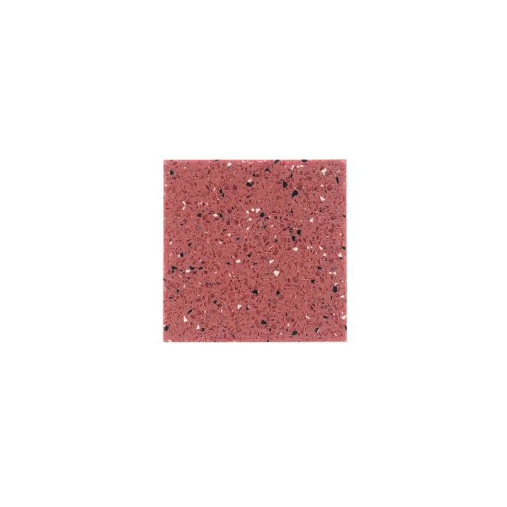 Hot pink solid surface with black and white recycled hard plastic aggregate for countertop application.