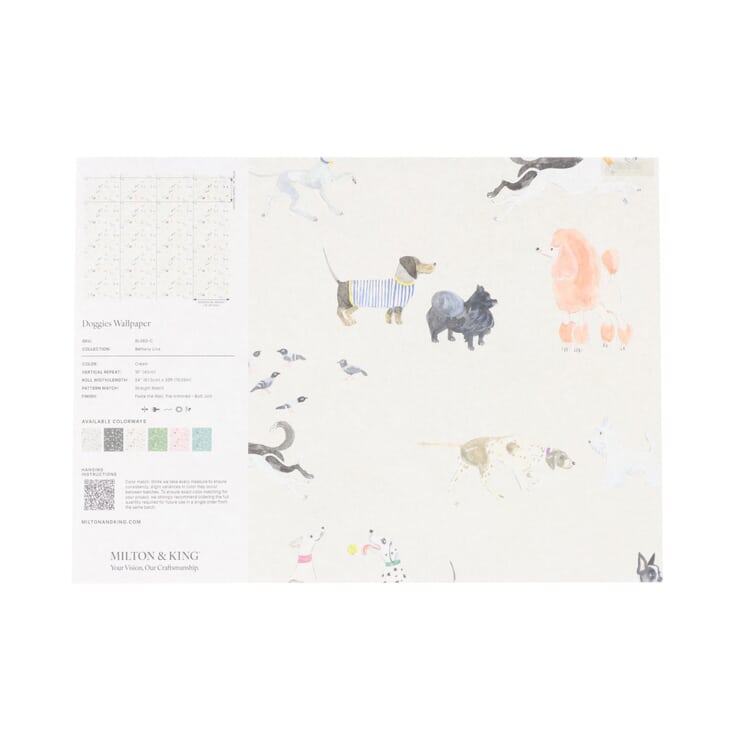Doggies wallpaper is a tribute to our lovable, dog best friends. These pups are energetically chasing balls and socially sniffing each other. Some are not so social like the glamorous poodles that had just come from the groomers. So many breeds from Dalmatians and Dachshunds to Bull Terriers and Schnauzers, make this lovable dog wallpaper design a must have for dog lovers. It is suitable for everything from a kids room to a kitchen. Bethany Linz created this design by hand-painting the characters with Gouache and then hand-cutting and placing them into a fun, cheerful collage.