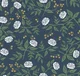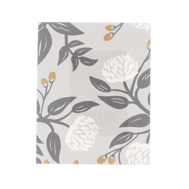 One of the original prints in the Rifle Paper Co. repertoire, Peonies features large blooms and delicate buds with an effortless, elegant feel. Featured here in white, metallic gold, and charcoal against grey. Peonies is a peel and stick, non woven wallpaper measuring 27 inches wide by 20 feet long, covering approximately 45 square feet per roll.